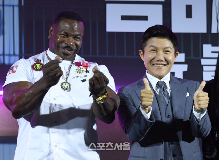 안드레 러시, 조세호가 14일 서울 CGV용산아이파크몰에서 열린 넷플릭스 예능 ‘?좀비버스: 뉴 블러드’ 제작발표회에서 포토타임을 갖고 있다.