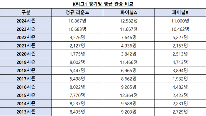올 시즌만 놓고 봐도 정규리그 평균 관중(1만867명)보다 많고 파이널A(1만2582명)와 큰 차이가 없다. 프로연맹 관계자는 “생존 싸움을 하는 구단의 심정은 누구나 이해한다. 그러나 다시 제도를 바꾸는 데 명분이 되기는 어렵다. 시즌 막판 하위리그의 긴장감, K리그2 활성화 측면에서 도움이 되는 게 사실”이라고 했다.