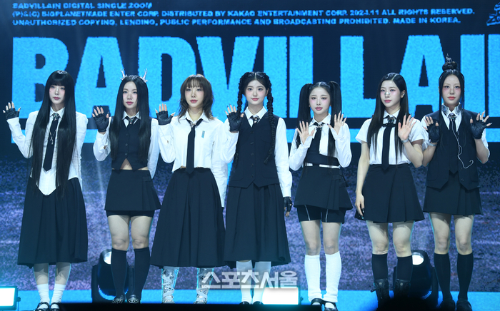 걸그룹 배드빌런(BADVILLAIN) 윤서, 휴이, 엠마, 켈리, 클로이 영, 빈, 이나(왼쪽부터)가 19일 서울 광장동 예스24 라이브홀에서 열린 새 디지털 싱글 ‘숨(ZOOM)’ 발매 기념 미디어 쇼케이스에서 포토타임을 갖고 있다.