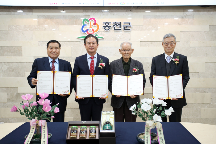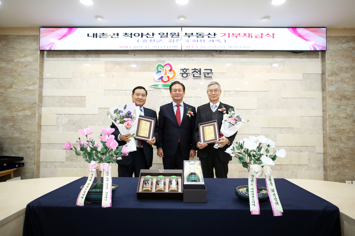 신영재 홍천군수는 11월 20일 군수 접견실에서 김창묵 회장과 가족들이 참석한 가운데 토지 기부 채납식을 개최하고 감사패를 수여했다.
