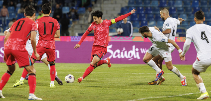 손흥민은 20일 오전(한국시간) 요르단 암만에 있는 암만 국제경기장에서 끝난 2026 북중미 월드컵 아시아 지역 3차 예선 B조 6차전 팔레스타인전에 동점골을 기록했다. 0-1로 뒤진 전반 16분 이재성과 패스를 주고받아 페널티박스로 진입한 뒤 완벽한 오른발 감아차기 슛으로 골망을 흔들었다.