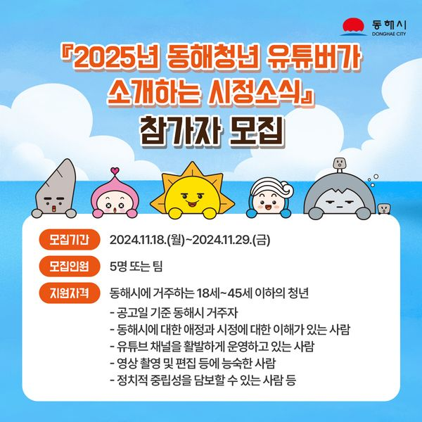 공고일 기준 동해시에 거주하는 18~45세 이하의 청년이면 누구나 지원할 수 있고 11월 29(금)까지 e메일로 접수하면 된다. 이후, 신청자를 대상으로 영상제작능력, SNS 활동사항, 의지 등 다양한 항목을 평가해 선발할 계획이다.