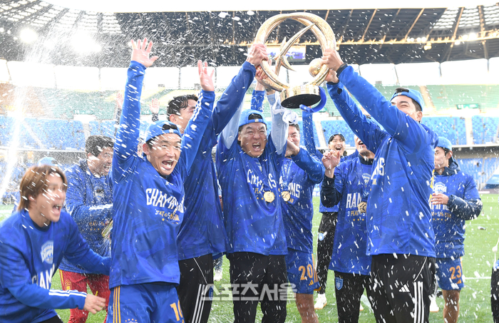 울산HD 김판곤 감독이 23일 울산 문수축구경기장에서 열린 K리그1 우승 시상식 후 선수들과 우승트로피를 들고 환호하고 있다.