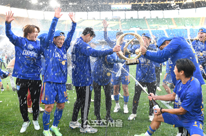 울산HD 김판곤 감독이 23일 울산 문수축구경기장에서 열린 K리그1 우승 시상식 후 선수들과 우승트로피를 들고 환호하고 있다.