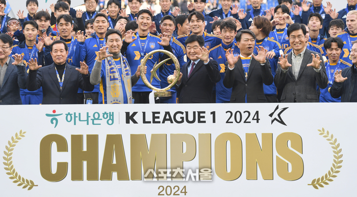HD현대 정기선 수석부회장, 권오갑 회장, 울산 HD 김광국 대표가 23일 울산 문수축구경기장에서 열린 K리그1 우승 시상식에서 포즈를 취하고 있다.