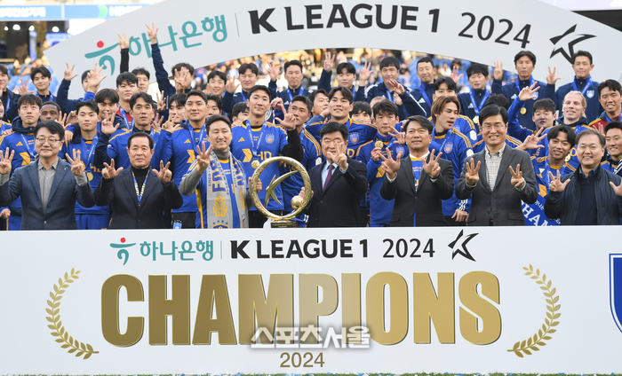 HD현대 정기선 수석부회장, 권오갑 회장, 울산 HD 김광국 대표이사RK 23일 울산 문수축구경기장에서 열린 K리그1 우승 시상식에서 김판곤 감독과 우승트로피를 들고 환호하고 있다.