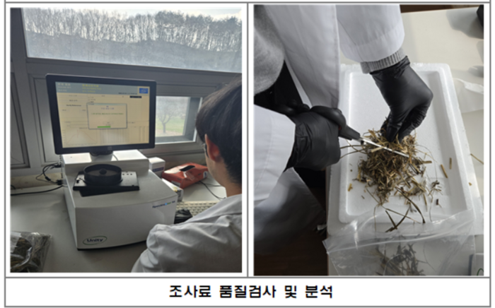 축산기술연구소는 2015년부터 실시하여 올해까지 3,139점(동계 2,239점, 하계 900점)을 검사하였으며, 검사항목으로는 수분과 조단백을 측정 하고 분석한다. 이 과정에서 근적외선분광법(NIRS)*을 이용하여 4단계**로 품질등급을 판정한다.