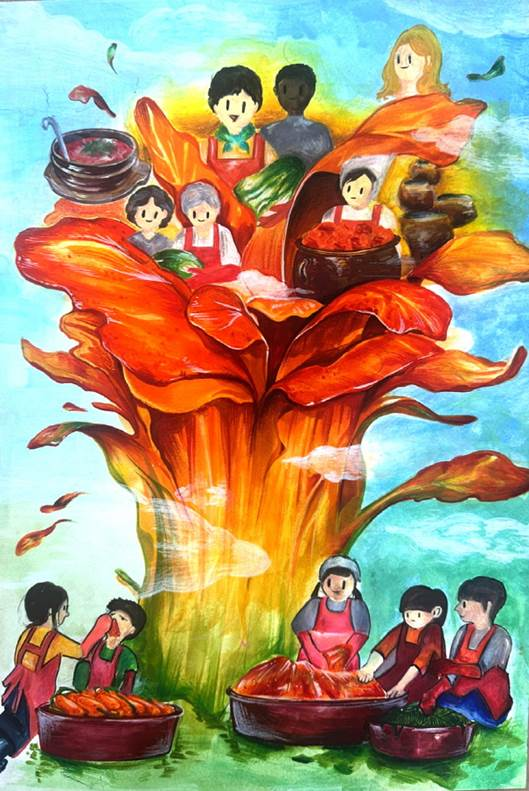그림 부문 최우수상을 수상한 김규빈 어린이는 ‘각티슈처럼 어디서든 쉽게 뽑아 먹는 맛있는 김치’를 주제로 편의점에서 친구들과 간식을 먹을 때 꼭 필요한 김치를 맛있게 먹고 있는 모습을 그림으로 표현했다. 미래에는 각티슈처럼 생긴 통에서 쉽게 뽑아 먹을 수 있는 김치가 있는 것을 상상하며 표현한 그림이다. 동시 부문 최우수상을 수상한 김소민 어린이는 매운 맛에 놀라 김치와 맞서다가 어느새 김치가 맛있어지고 ‘최애 음식’이 된 경험을 동시로 표현했다.