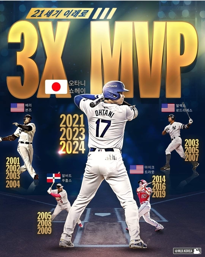 오타니는 지난 2021년과 2023년엔 LA에인절스 소속으로 아메리칸리그(AL) MVP에 올랐고 이번 NL MVP 수상으로 양대 리그에서 모두 MVP에 오른 역대 두 번째 선수라는 진기록도 남겼다.