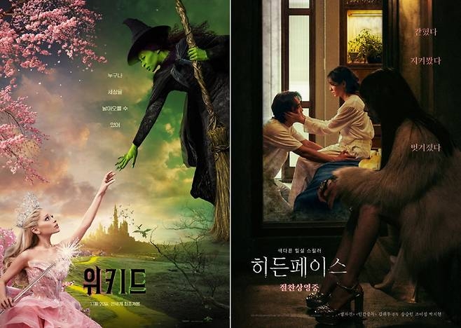24일 영화진흥위원회 영화관입장권 통합전산망을 살펴보면 ‘위키드’는 지난 23일 하루동안 21만4847명을 동원했다. 누적관객수는 45만5282명이다. ‘히든페이스’는 같은 날 10만3288명이 봤다. 누적관객수는 26만1516이다.
