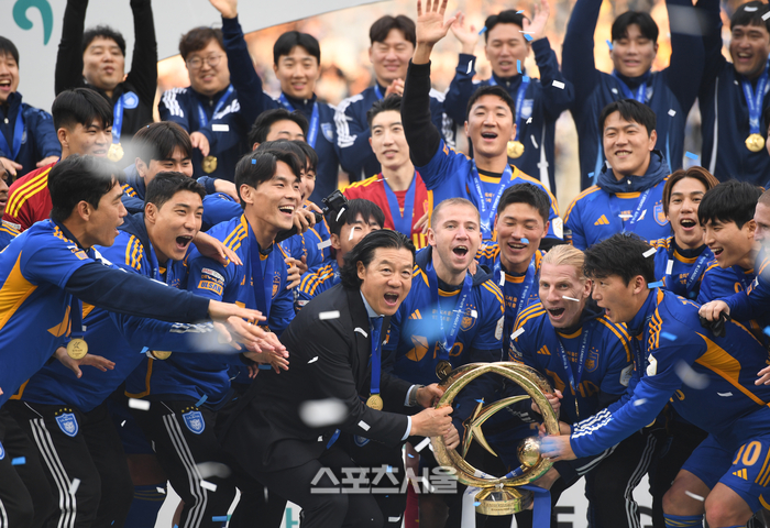 김 감독은 지난 1996년 울산이 리그 첫 별을 달 때 선수로 뛰었다. 지도자로 28년 만에 울산에 돌아와 우승컵을 다시 들어올리는 역사를 썼다. 그는 “1996년 우승할 땐 주력 선수가 아니었다. 당시 기쁨이 많이 남아 있진 않은 것 같다”며 지도자로 울산의 우승을 이끈 것에 더 의미를 뒀다.
