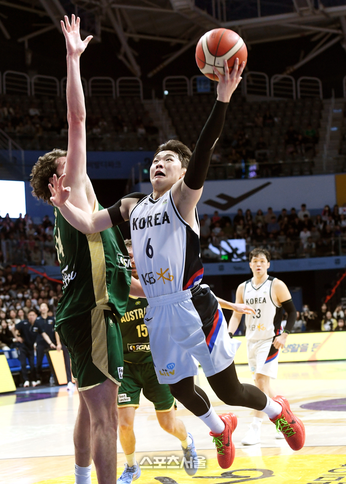 대한민국 농구 대표팀의 문유현이 21일 고양 소노 아레나에서 열린 FIBA 아시아컵 예선 호주와의 경기에서 레이업슛을 하고 있다. 2024. 11. 24.