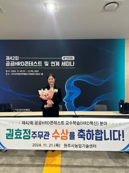 [스포츠서울ㅣ원주=김기원기자]원주시농업기술센터 권효정 주무관(농촌지도사)은 지난 21일 국가공무원인재개발원에서 주최한 ‘제42회 공공 HRD 콘테스트’에서 국가공무원인재개발원장상을 수상했다.
