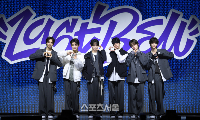 투어스(TWS) 영재,지훈,한진,도훈,경민,신유(왼쪽부터)가 25일 서울 용산구 블루스퀘어에서 열린 싱글 1집 ‘라스트 벨’ 발매기념 미디어 쇼케이스에서 포토타임을 갖고 있다.