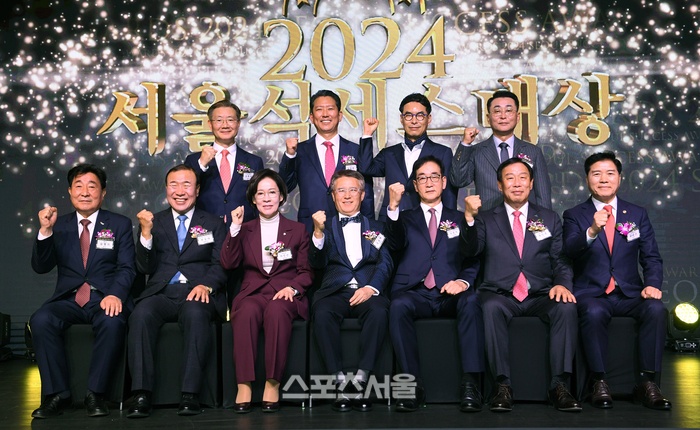 25일 서울 중구 그랜드 하얏트 서울 호텔에서 진행된 ‘제16회 서울 석세스대상’에서 정치-사회 부문 수상자들이 기념촬영을 하고 있다. (윗줄 왼쪽 부터) 손희식 굿모닝경제 대표, 기초행정대상 김장호 구미시장, 안희선 서울STV 대표, 이존백 스포츠서울 대표, (아랫줄 왼쪽부터)기초행정대상 김명기 횡성군수, 한상대 집행위원장, 의정대상 이인선 국회의원, 김상혁 굿모닝미디어그룹 회장, 이준식 조직위원장, 광역행정대상 최민호 세종자치특별시장, ESG환경대상 김경안 새만금개발청장.