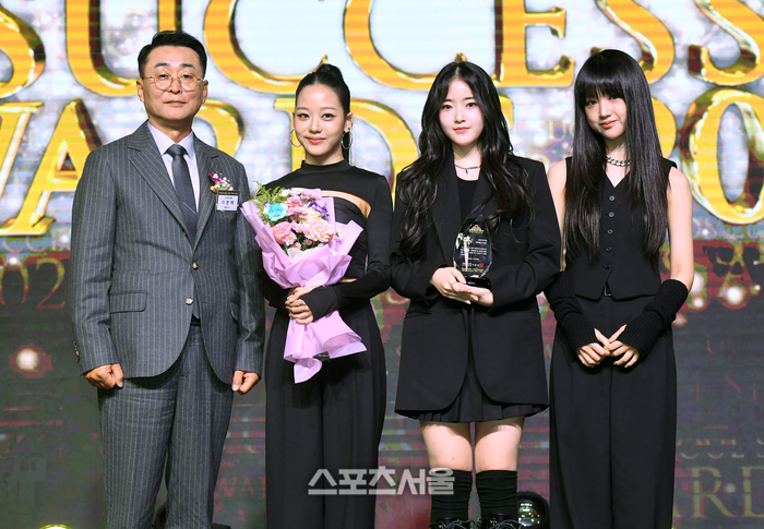 걸그룹 비비업이 25일 서울 중구 그랜드 하얏트 서울 호텔에서 진행된 ‘제16회 서울 석세스 대상’에서 신인가수대상을 수상한 뒤 시상자인 스포츠서울 이존백 대표와 기념촬영을 하고 있다.