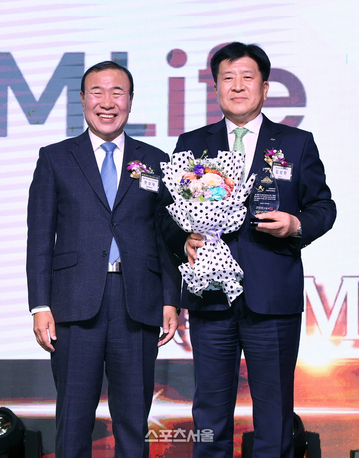 김성한 아이엠 라이프생명보험 대표(오른쪽)가 25일 서울 중구 그랜드 하얏트 서울 호텔에서 진행된 ‘제16회 서울 석세스 대상’에서 사회공헌대상을 수상한 뒤 시상자인 한상대 집행위원장과 기념촬영을 하고 있다.
