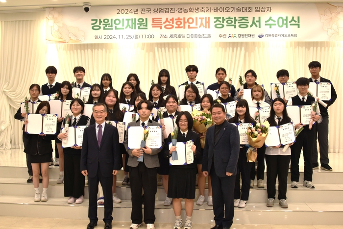[스포츠서울ㅣ춘천=김기원기자]강원인재원(원장 김학철)은 11월 25일(월) 오전 11시, 춘천 세종호텔 다이아몬드홀에서 금년도에 시행한 전국 고교생 상업경진대회, 영농학생축제, 바이오기술경진대회에서 입상한 특성화 인재 49명에 대한 장학증서 수여식을 개최했다고 밝혔다.