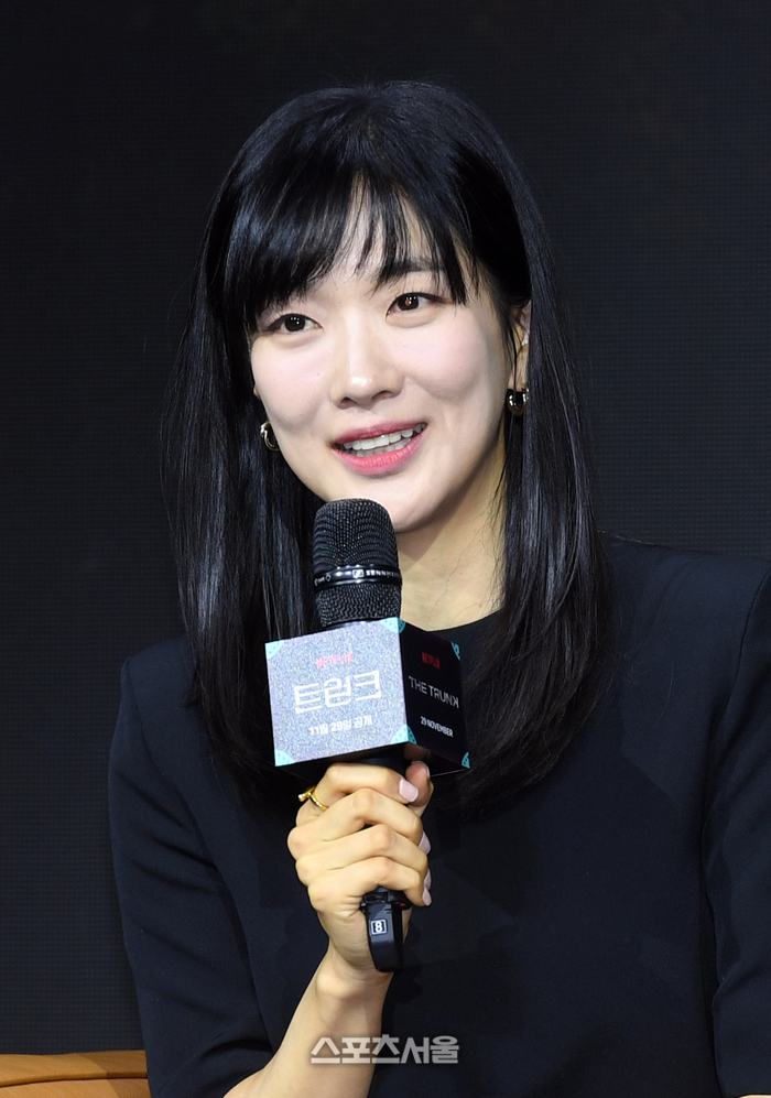 배우 정윤하가 26일 서울 강남구 라움아트센터에서 열린 넷플릭스 오리지널 ‘트렁크’ 제작발표회에서 사회자의 질문에 답을 하고 있다.