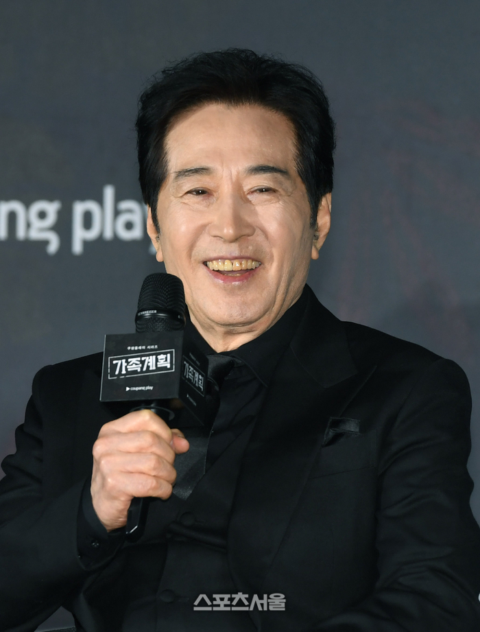 배우 백윤식이 26일 서울 용산구 몬드리안 호텔 이태원에서 열린 쿠팡플레이 오리지널 드라마 ‘가족계획’ 제작발표회에서 사회자의 질문에 답을 하고 있다.