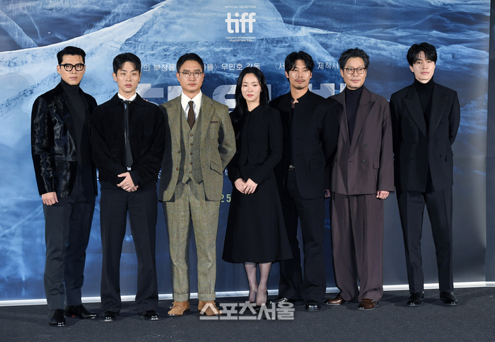27일 서울 용산구 아이파크몰 CGV에서 진행된 영화 ‘하얼빈’ 제작보고회에서 출연 배우들이 취재진을 향해 포즈를 취하고 있다. 왼쪽부터 배우 현빈, 박정민, 조우진, 전여빈, 우민호 감독, 배우 박훈, 유대명, 이동욱.