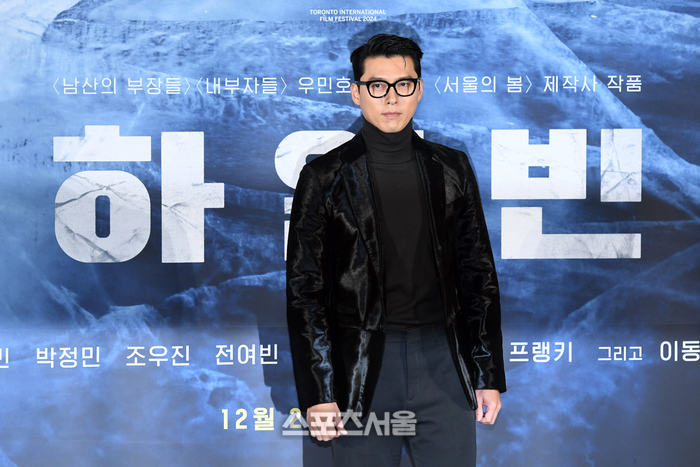 배우 현빈이 27일 서울 용산구 아이파크몰 CGV에서 진행된 영화 ‘하얼빈’ 제작보고회에서 취재진을 향해 포즈를 취하고 있다.