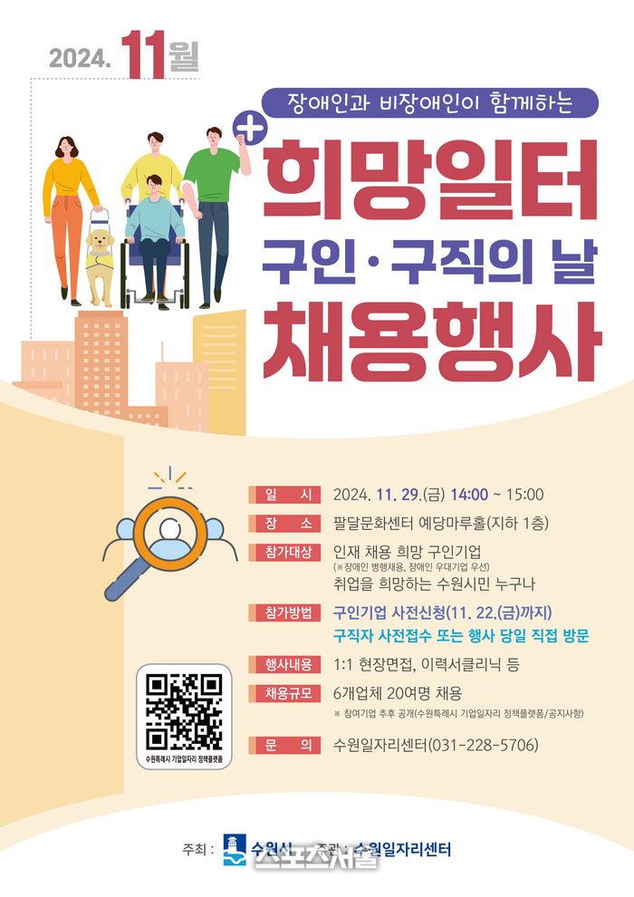 〔스포츠서울│수원=좌승훈기자〕 경기 수원시는 29일 오후 2시부터 3시까지 팔달문화센터 예당마루홀에서 ‘11월 희망일터 구인·구직의 날’ 행사를 연다.