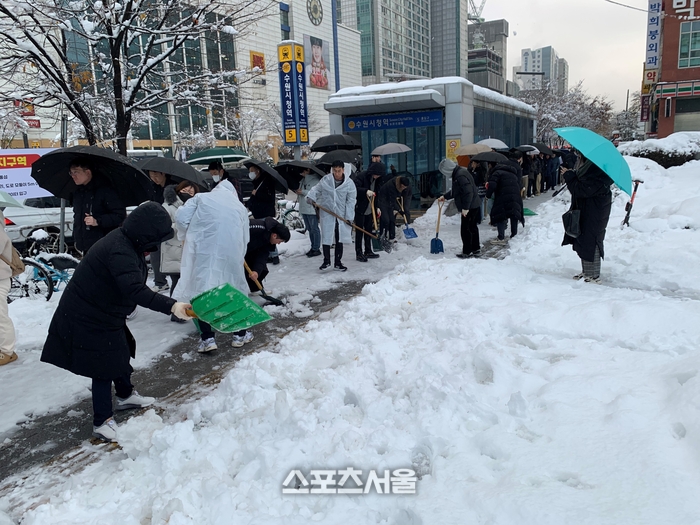 28일 오전 7시 시청·구청·사업소 직원 1500여 명이 44개 동(동별 30~40명), 버스정류장, 전철 역사 주변 등 시민들이 많이 다니는 길에서 3시간여 동안 제설 작업을 했다.
