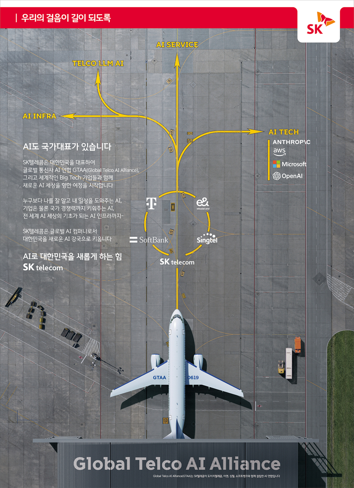 그중 GTAA 편은 각 나라를 대표하는 국가대표가 존재하듯, SKT는 대한민국을 대표하여 새로운 AI 세상을 열기 위해 글로벌 통신사 AI 연합과 세계적인 Big Tech 기업들이 함께 한다는 것을 표현한 안입니다.