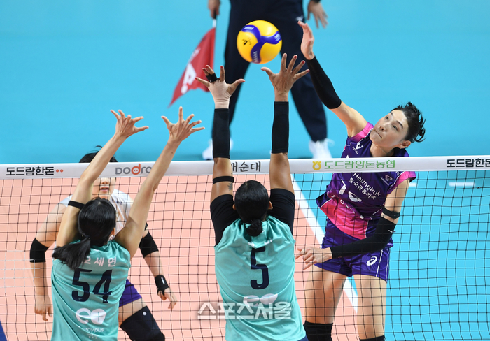 흥국생명 김연경(오른쪽)이 28일 장충체육관에서 열린 2024-2025 V리그 여자부 GS칼텍스와의 경기에서 스파이크 공격을 하고 있다. 2024. 11. 28.