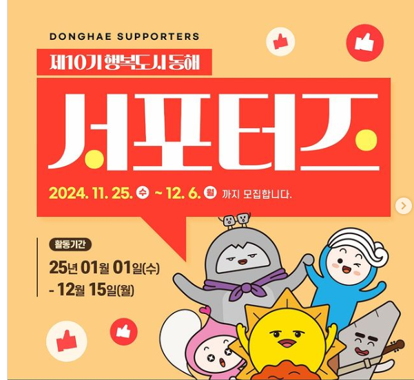 SNS의 중요도가 점점 더 높아지는 흐름에 발맞춰, 시는 SNS를 통한 시정 홍보에 집중하기 위해 ‘2025년 행복도시 동해 제10기 SNS 서포터즈’를 운영, 동해시에 대한 이해도와 홍보에 관심이 높고 SNS를 활발하게 운영하며, 사진 촬영 및 편집 및 작문 등에 능숙한 서포터즈를 모집한다.