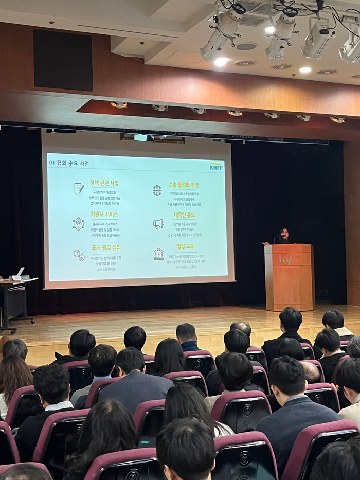 본격적인 행사는 식품의약품안전평가원(영양기능연구과 과장 이순호)의 축사로 시작됐다. 발표는 △건강 노화와 연하(서울대병원 오병모 교수) △건강기능식품 시장 트렌드(한국건강기능식품협회 이슬 팀장) △수면 기능성 원료인 라임과피주정추출물 개발 사례 및 개별인정 연구 전략(부경대 조승목 교수) △마리골드꽃 추출물을 이용한 눈 건강 연구개발 및 제품화 사례(노바렉스 정재철 부사장) △관절 건강 건강기능식품 개발 및 제품화 사례(hy연구소 박수동 팀장) 순으로 진행됐다.