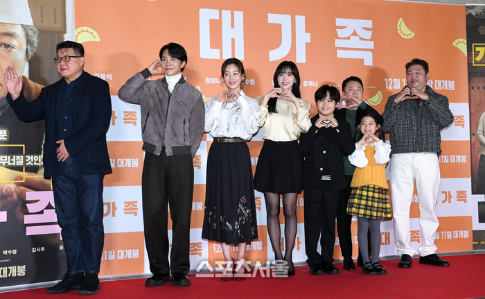 영화 ‘대가족’의 양우석 감독과 주연 배우들이 2일 서울 송파구 롯데시네마 월드타워에서 진행된 영화 ‘대가족’ VIP 시사회에 참석하면서 포토월 앞에서 포즈를 취하고 있다. 왼쪽부터 양우석 감독, 배우 이승기, 김성령, 강한나, 김시우, 윤채나, 박수영, 최무성. 2024. 12. 2.