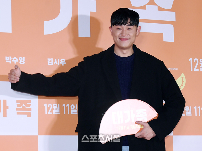 유튜버 진우가 2일 서울 송파구 롯데시네마 월드타워에서 진행된 영화 ‘대가족’ VIP 시사회에 참석하면서 포토월 앞에서 포즈를 취하고 있다. 2024. 12. 2.