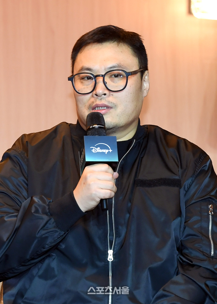 강풀 작가가 3일 서울 강남구 코엑스 컨벤션 그랜드볼룸에서 진행된 디즈니+ ‘조명가게’ 제작발표회에서 인사말을 하고 있다.