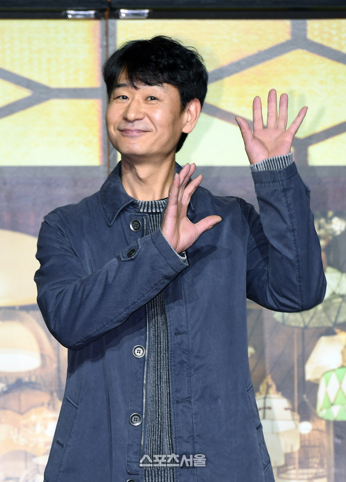 배우 박혁권이 3일 서울 강남구 코엑스 컨벤션 그랜드볼룸에서 진행된 디즈니+ ‘조명가게’ 제작발표회에서 취재진을 향해 포즈를 하고 있다.