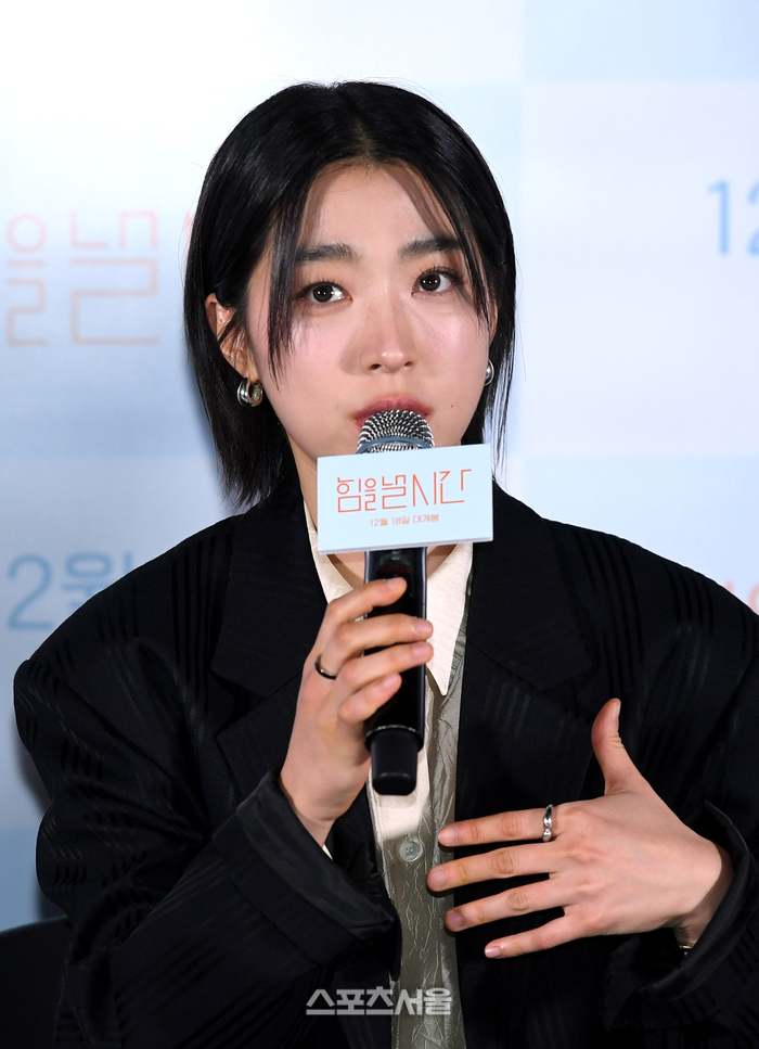 배우 최성은이 3일 서울 용산구 아이파크몰 CGV에서 진행된 영화 ‘힘을 낼 시간’ 시사회 및 기자간담회에서 사회자의 질문에 답을 하고 있다.