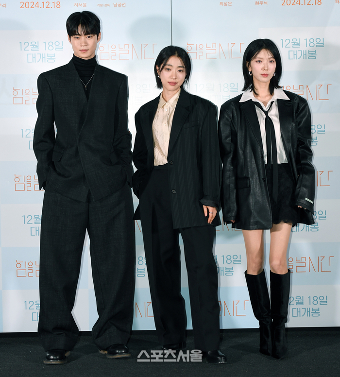배우 현우석(왼쪽)과 최성은(가운데), 하서윤이 3일 서울 용산구 아이파크몰 CGV에서 진행된 영화 ‘힘을 낼 시간’ 시사회 및 기자간담회에서 취재진을 향해 포즈를 취하고 있다.