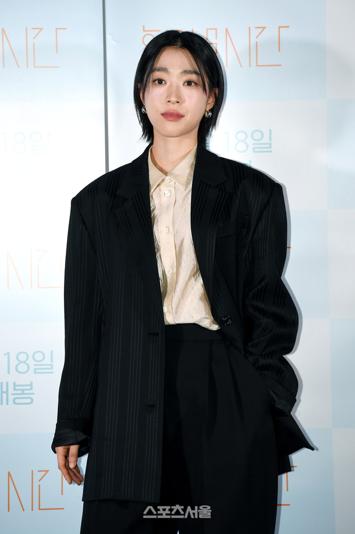 배우 최성은이 3일 서울 용산구 아이파크몰 CGV에서 진행된 영화 ‘힘을 낼 시간’ 시사회 및 기자간담회에서 취재진을 향해 포즈를 취하고 있다.