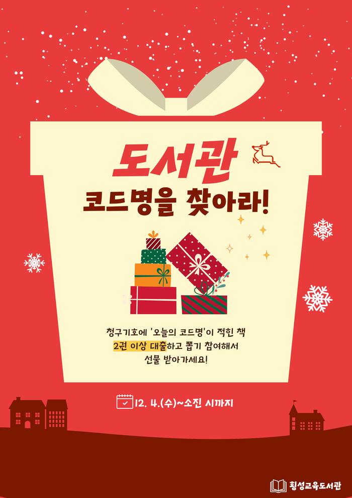 [스포츠서울ㅣ김기원기자]강원특별자치도교육청횡성교육도서관(관장 최복진)은 연말을 맞이하여 12월 4일부터 12월 8일까지 ‘도서관 코드명을 찾아라!’행사를 운영한다.