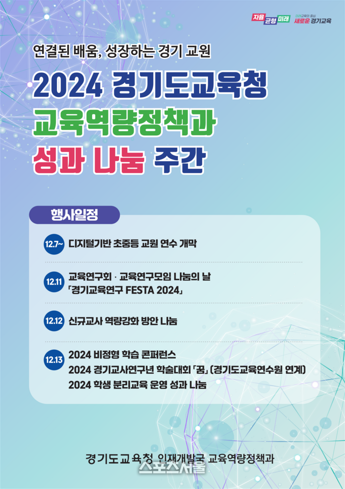 우선 11일에는 도내 153개의 도 단위 교육연구회 및 250개의 디지털 교육연구회 소속 교원이 ‘경기교육연구 2024 페스타(FESTA)’를 진행한다.
