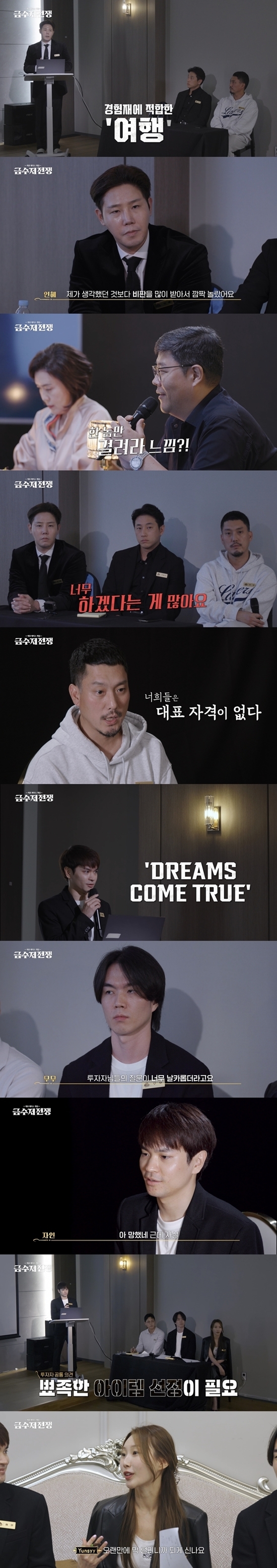 투자자들은 공통적으로 “뾰족한 아이템 선정과 명확한 콘셉트의 체험이 필요하다”라고 조언했다. 자인은 “아...망했네”라면서도 “큰 영감을 받았다”라고 속마음을 밝혔다. 윤씨는 “오랜만에 막 털리니까 되게 신난다”라며 발랄함을 잃지 않았다. 과연 국내 최고의 투자자들이 자인 팀과 인혜 팀 중 어느 팀에 베팅했을지 ’금수저 전쟁‘ 다음 편에서 공개된다.