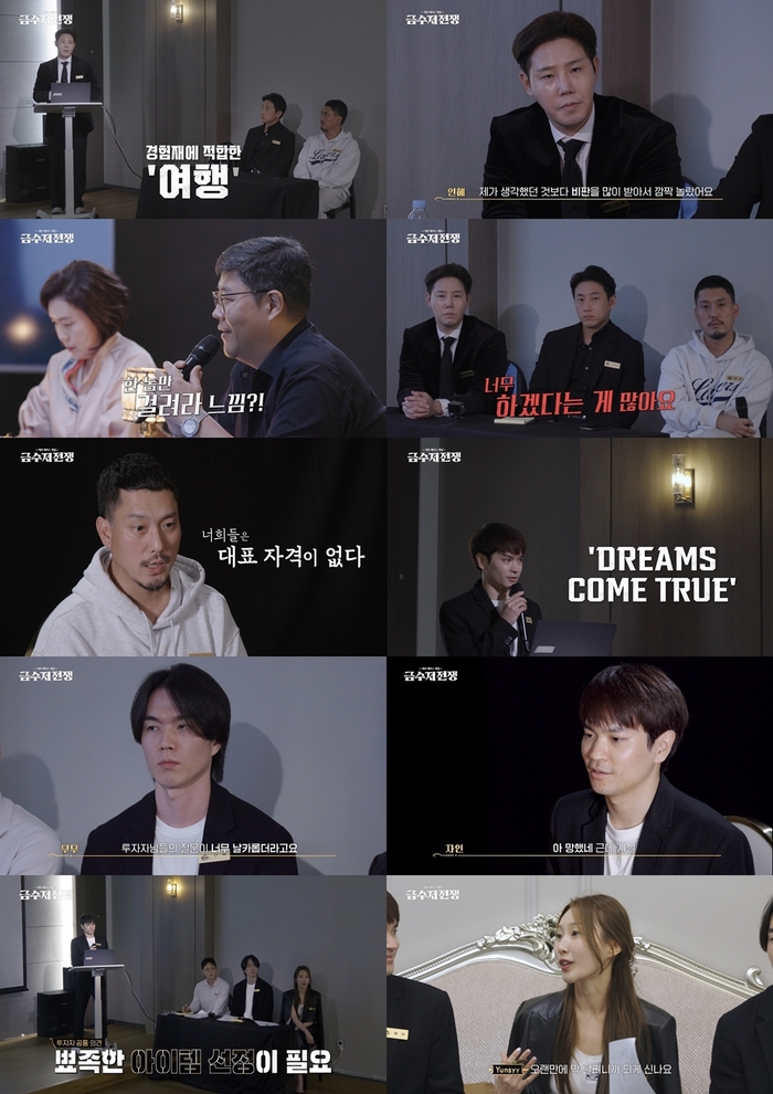 [스포츠서울 | 원성윤 기자] LG유플러스 STUDIO X+U 제로 베이스 게임 ‘금수저 전쟁’ 금수저들이 드디어 팝업 계획을 발표하며 사업가로서의 면모를 드러냈다. 생전 처음 듣는 투자전문가들의 혹독한 비판 앞에서 잔뜩 움츠러든 금수저들의 모습이 시선을 강탈했다.