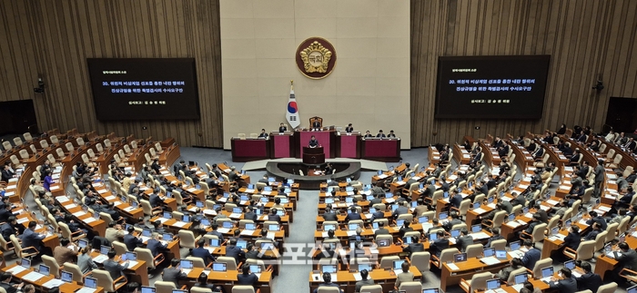 여·야는 본회의가 열리기 직전까지 막판 협상을 진행했지만 합의에 이르지 못했다. 여·야 간 합의 없는 예산안 통과는 헌정사 처음이다. sangbae0302@sportsseoul.com