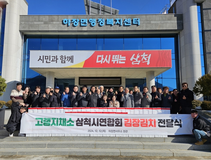 [스포츠서울ㅣ김기원기자]고랭지채소 삼척시연합회(회장 : 이동열)는 12월 12일 하장면 행정복지센터 광장에서 김장김치 전달식을 갖고 지역 어르신들이 이용하는하장면 15개리 경로당에 전달해 달라며 김장김치 75박스(박스당 13kg)를 기탁했다.