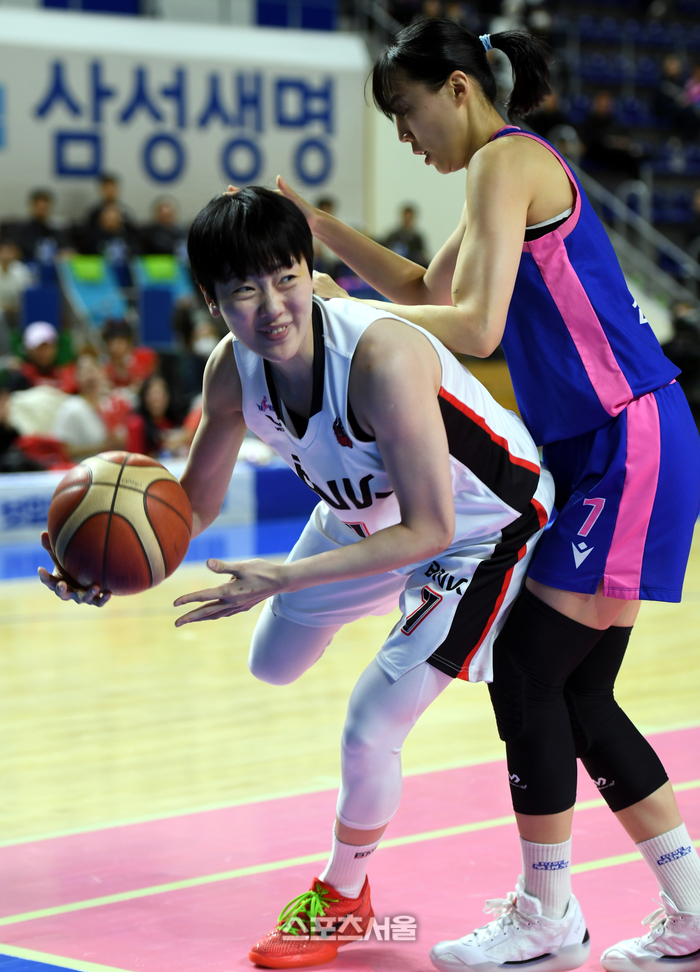BNK 썸 박혜진이 12일 용인체육관에서 열린 2024~2025 여자프로농구 삼성생명과 경기에서 루스볼을 차지한 후 패스를 하고 있다.