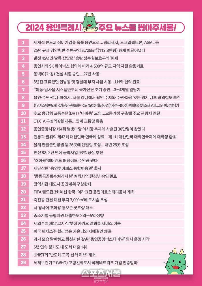▲ 세계적 반도체 장비기업들 속속 용인으로…램리서치, 도쿄일렉트론, ASML 등▲ 25년 규제 경안천변 수변구역 3.728㎢(112.8만평) 해제 이끌어 냈다▲ 시 발전 45년간 발목 잡았던 ‘송탄 상수원보호구역’ 해제▲ 용인시와 SK 하이닉스 협약에 따라 4,500억 규모 지역 자원 활용키로▲ 동백IC(가칭) 건설 최종 승인...27년 착공▲ 8년간 표류했던 언남동 옛 경찰대 부지 사업 시동…LH와 협의 완료▲ “이동·남사읍 시스템반도체 국가산단 조기 승인...3~4개월 앞당겨▲ 용인·수원·성남·화성시, 서울 강남에서 용인 수지와 수원·화성 잇는 경기 남부 광역철도 추진▲ 첨단시스템반도체 국가산단 관통하는 국도 45호선 확장사업(4차선→8차선) 예비타당성 조사 면제...3년 이상 앞당겨▲ 수요 응답형 교통수단(DRT) ‘타바용’ 도입…교통거점 구축해 주요 관광지 연결▲ GTX-A 구성역 6월 개통…연계 교통망 확충▲ 용인중앙시장 제4회 별빛마당 야시장 축제에 사흘간 30만명이 찾았다▲ 전통과 권위의 제42회 대한민국 연극제 성료…제1회 대한민국 대학연극제에 대학생 환호▲ 올해 만골근린공원 등 26곳에 맨발길 조성…내년 26곳 조성▲ 민선 8기 2년 만에 공약사업 93% 정상 추진▲ ‘조아용’ 에버랜드 퍼레이드 주인공 됐다▲ 새 단장한 ‘용인투어패스 통합이용권’ 출시▲ ‘동림공공하수처리시설’ 설치사업 환경부 승인 완료▲ 광역시급 대도시 공간계획 구상한다▲ FIFA 월드컵 3차 예선 한국-이라크전 용인미르스타디움서 개최▲ 죽전동 탄천 폐천 부지 3,000㎡에 도시 숲 조성▲ 시 청사에 조아용 홍보존 굿즈샵 개소▲ 중소기업 동행지원 대출한도 2억→5억 상향▲ 세외수입 체납 고지·납부에 카카오 알림톡 서비스 이용▲ 미국 텍사스주 윌리엄슨 카운티와 자매결연 체결▲ 과거 모습 탈피하고 최신시설 갖춘 ‘용인공영버스터미널’ 임시 운영 시작▲ 6년 연속 경기도 내 도서 대출 1위▲ UNIST와 ‘반도체 교육·산학 허브’ 개소▲ 세계보건기구(WHO) 고령친화도시 국제네트워크 가입 인증받아
