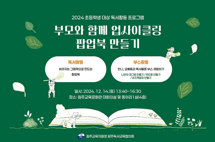 이번 행사는 독서·인문교육 활성화를 위해 원주독서교육협의회 주관으로 운영되며, ‘버려지는 그림책으로 만드는 팝업북’을 주제로 초등학생들이 부모님과 함께 참여하여 독서에 대한 긍정적 인식을 함양할 것으로 기대된다.