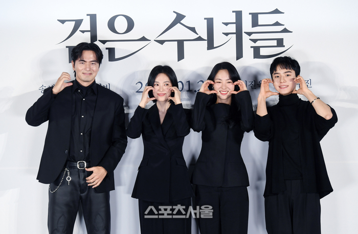 배우 이진욱(왼쪽부터), 송혜교, 전여빈, 문우진이 16일 서울 용산구 아이파크몰 CGV에서 진행된 영화 ‘검은 수녀들’ 제작보고회에서 취재진을 향해 포즈를 취하고 있다.
