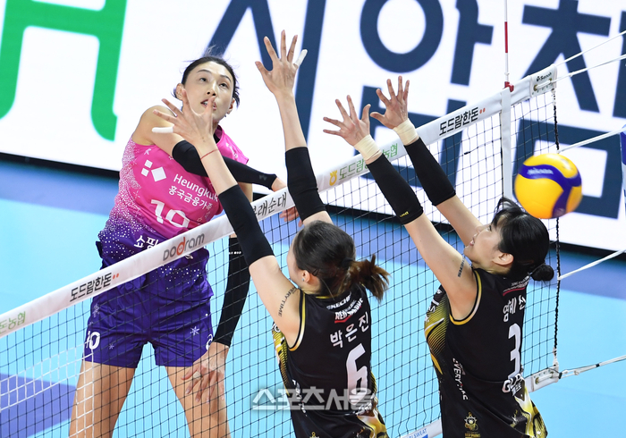 흥국생명 김연경(왼쪽)이 17일 인천 삼산월드체육관에서 열린 2024-2025 V리그 여자부 정관장과 경기에서 스파이크 공격을 하고 있다. 2024. 12. 17.